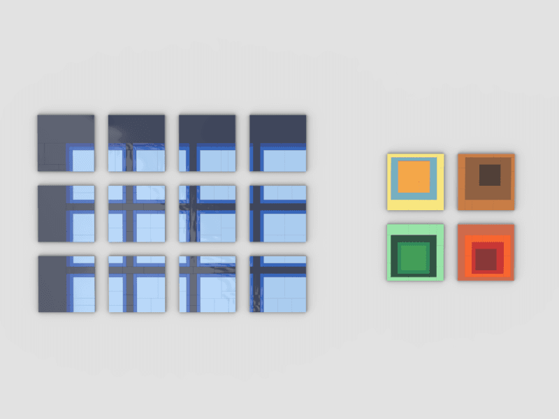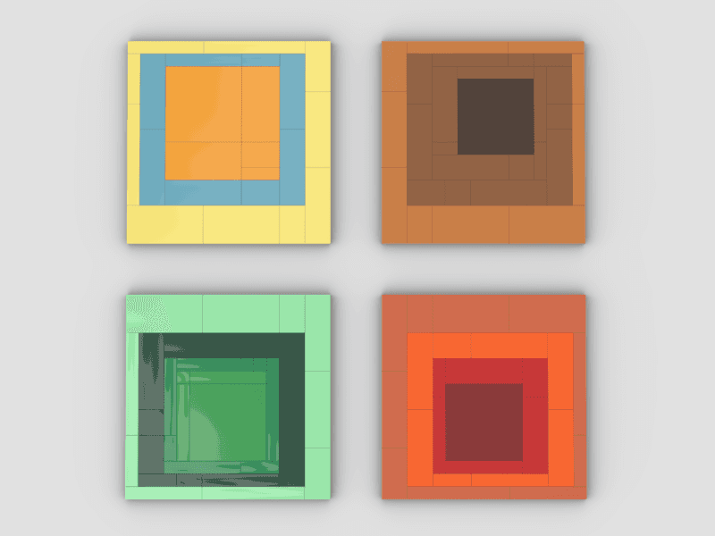 This version is based on Albers’ Homage to the Square, focusing on how colours interact with each other. Each piece is a set of nested rectangles in bold, contrasting colours. The LEGO tiles add depth and shadows, making it more dynamic than a flat painting.
