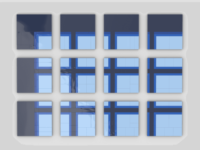 This version is inspired more by Agnes Martin’s style, with intersecting lines and calm, balanced colours. It has an architectural feel, almost like looking through a window. The glossy surface of the tiles and the visible seams between bricks give it extra texture that works well with the design.